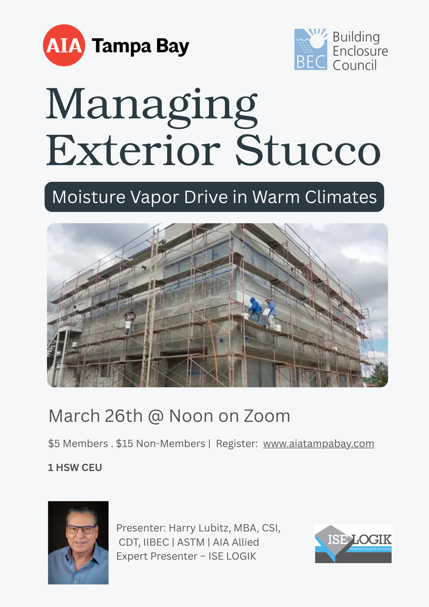 The challenge posed in the warm, humid climate of the south US region causes significant water management and vapor drive issues on the exterior envelope of stucco clad structures. There are several methods to manage the water and moisture vapor, and we will examine each to understand which provides the best option for both mass walls (i.e. Block or Precast Concrete) and framed walls (i.e. OSB sheathing on wood studs for residential structures and glass-mat sheathing on steel framed commercial structures). We will also examine the specific IBC, IRC and Florida Building Code language and requirements for exterior water management in both residential and commercial applications and provide guidance to minimize intrusion and prevent customer complaints and litigation.
