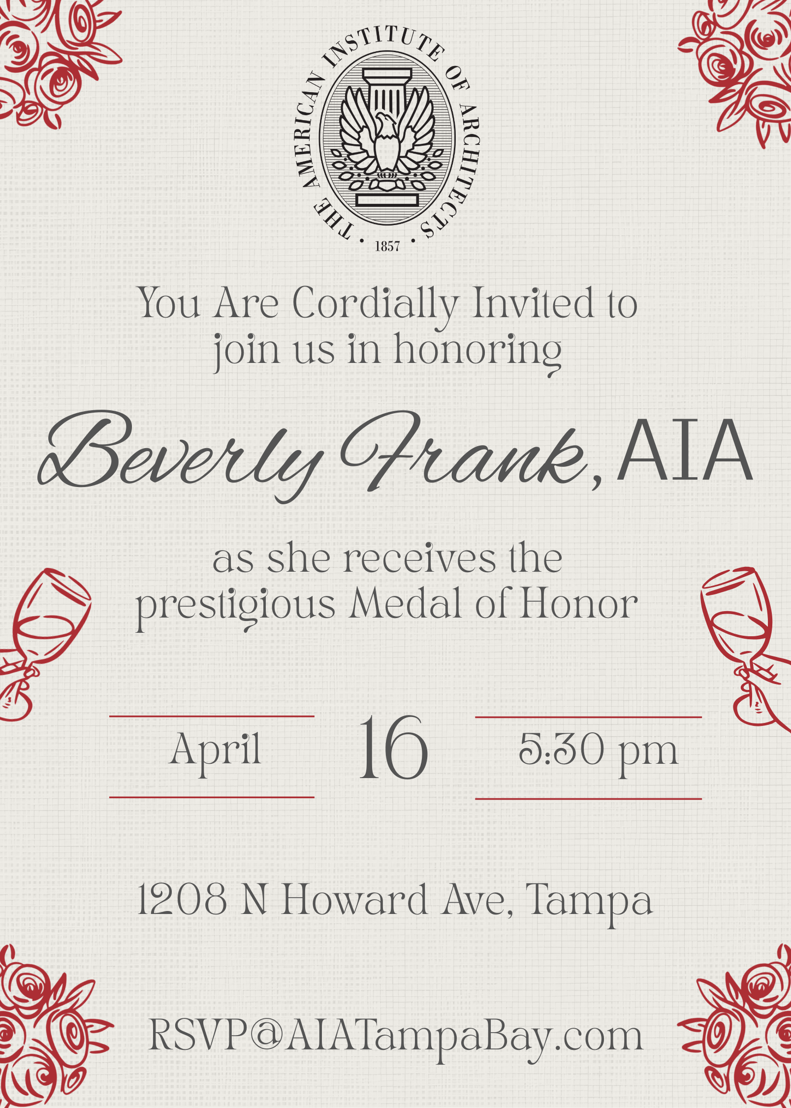 Beverly Frank Medal of Honor Reception Thursday, April 16, 2026 5:30 AM 7:30 AM Google Calendar ICS RSVP@aiatampabay.com