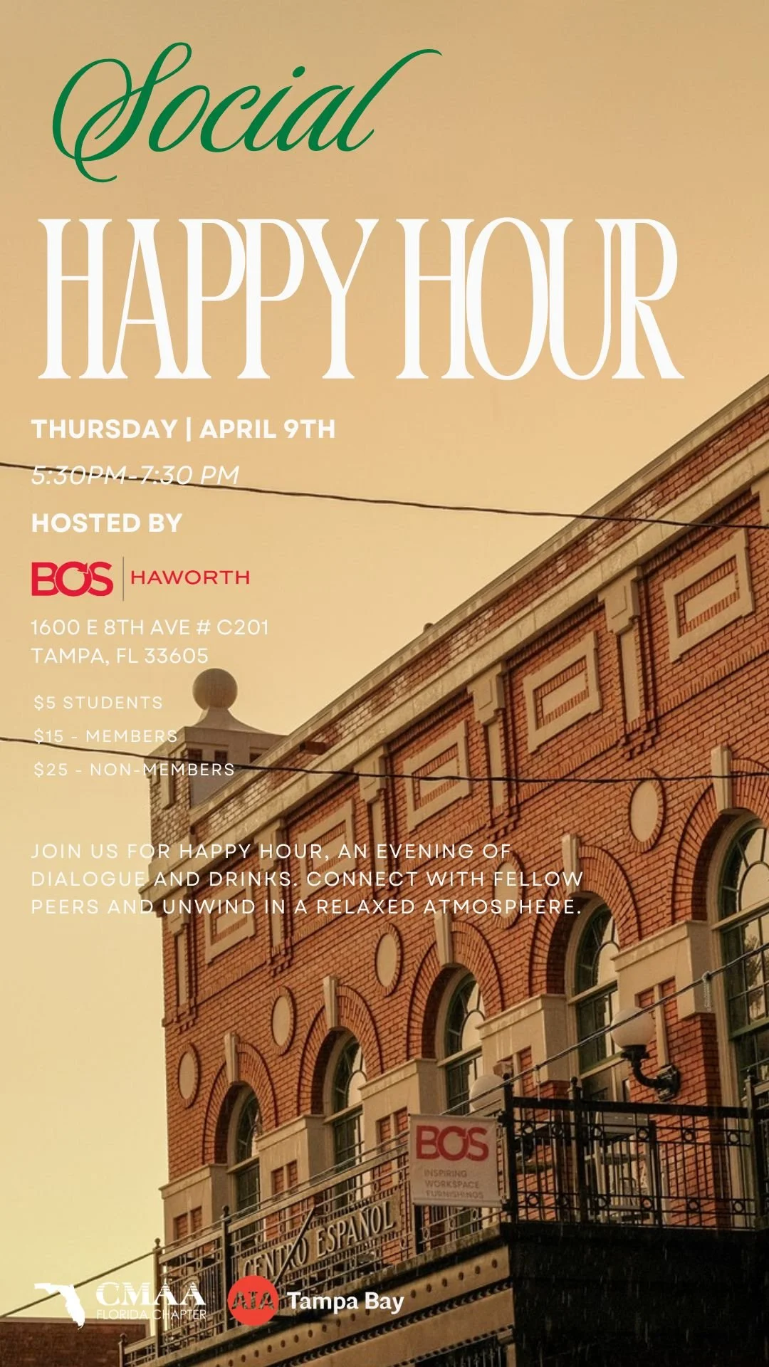 Back to All Events Mixer CMAA and AIATB at BOS Thursday, April 9, 2026 5:30 AM 7:30 AM BOS Haworth 1600 East 8th Avenue Tampa, FL, 33605 United States (map) Google Calendar ICS REGISTER HERE