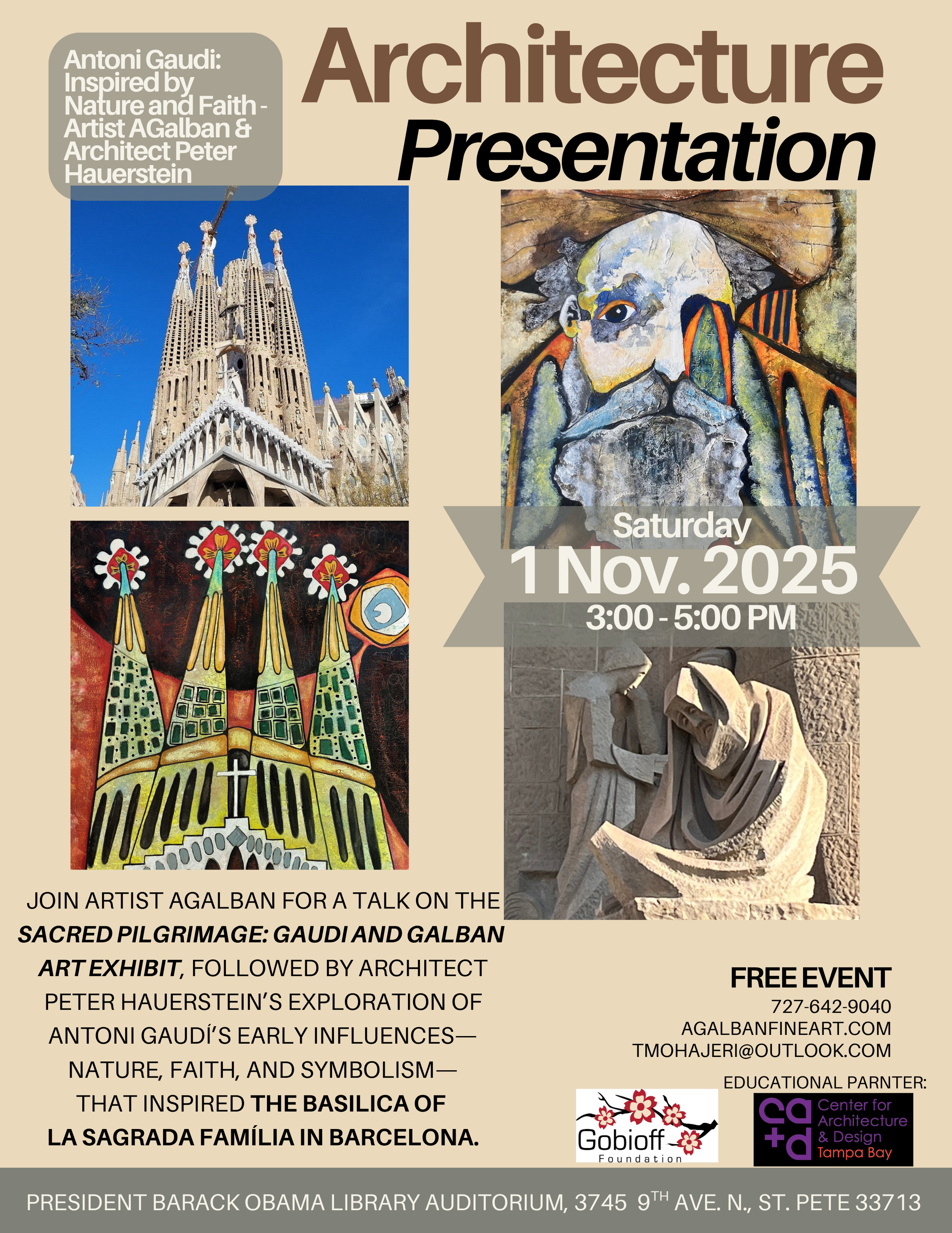 This special program is presented in partnership with the AIA Tampa Bay Center for Architecture and Design. The Sacred Pilgrimage: Gaudi and Galban Traveling Art Exhibit is made possible through generous support from the Gobioff Foundation and the City of St. Petersburg Individual Artist Grant.